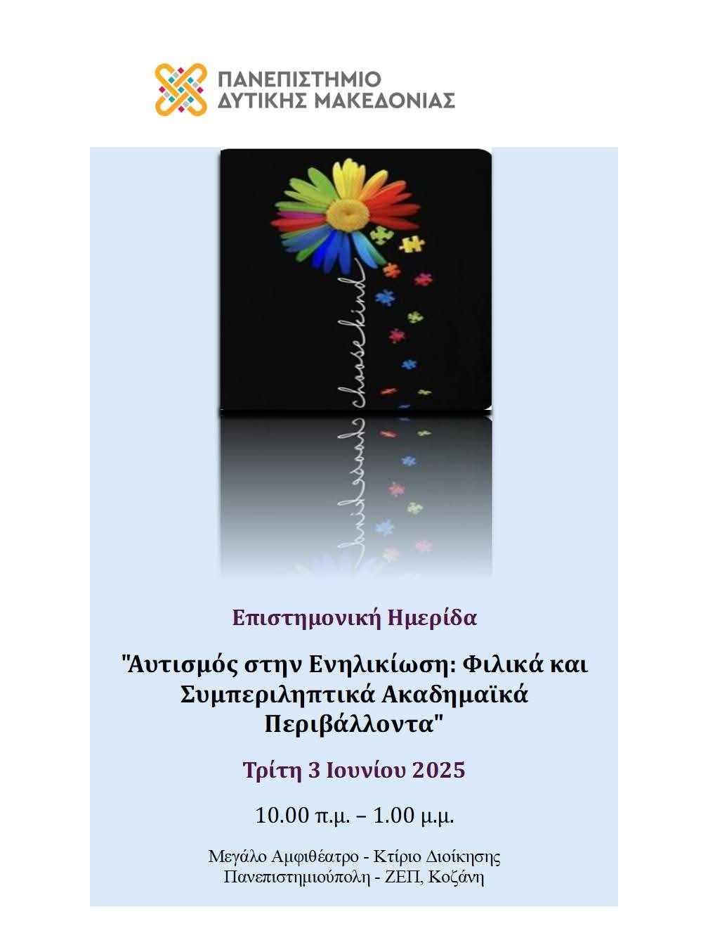 Η ημερίδα πραγματοποιήθηκε στο Μεγάλο Αμφιθέατρο του Κτιρίου Διοίκησης στην Πανεπιστημιούπολη ΖΕΠ στην Κοζάνη, με αφορμή την επικείμενη ένταξη του Πανεπιστημίου στο Δίκτυο «Φιλικά Πανεπιστημιακά Περιβάλλοντα για Άτομα με Διαταραχή Αυτιστικού Φάσματος (ΔΑΦ)».
