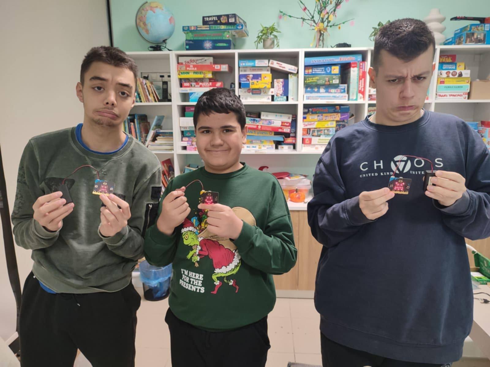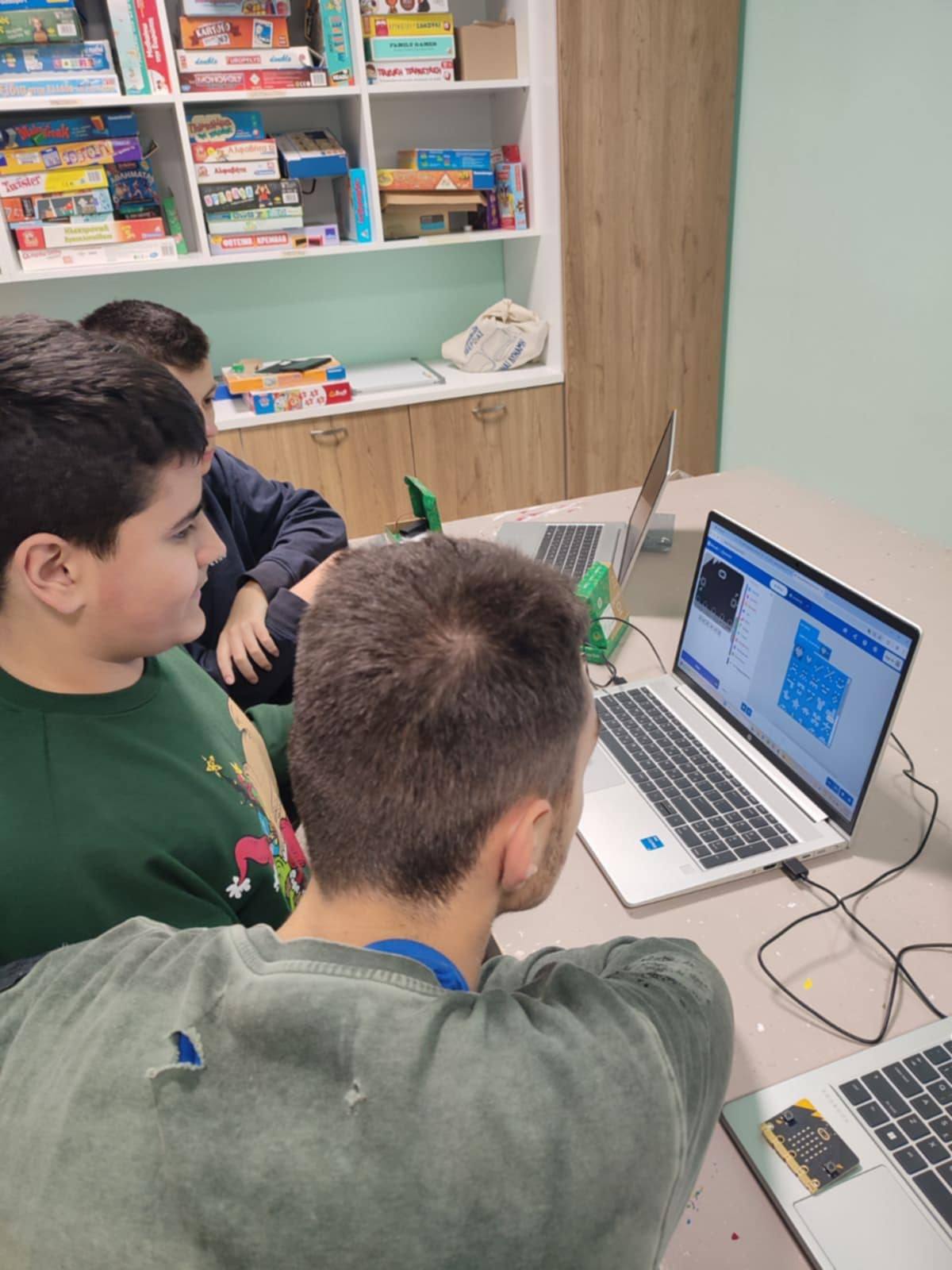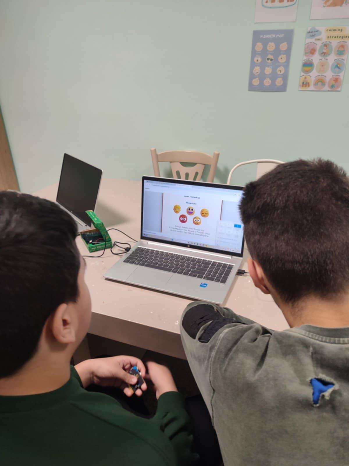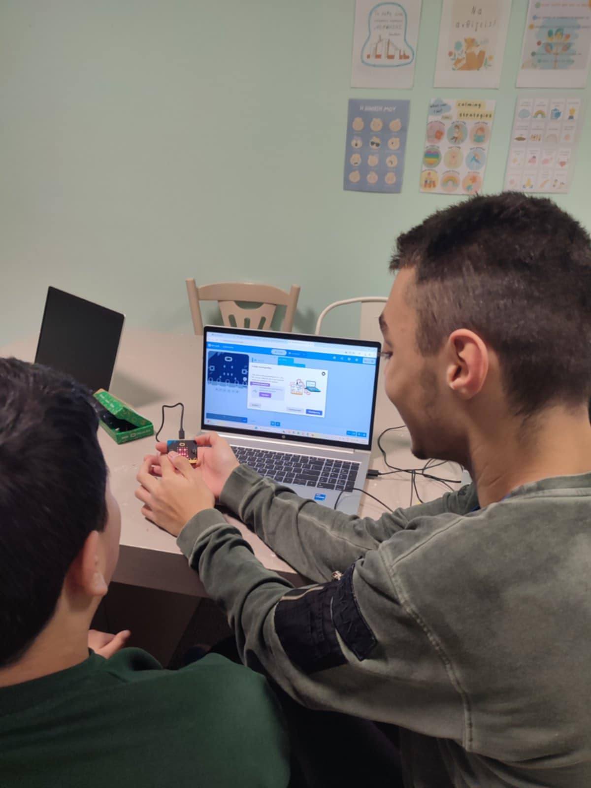 Η δράση ξεκίνησε με μια ιστορία γύρω από τα συναισθήματα, ανοίγοντας έναν ειλικρινή διάλογο για το πώς τα αναγνωρίζουμε και τα εκφράζουμε στην καθημερινότητά μας. Στη συνέχεια, οι έφηβοί μας πέρασαν στη βιωματική μάθηση: χρησιμοποιώντας το λάπτοπ και εφαρμόζοντας βασικά βήματα προγραμματισμού, κατάφεραν να προγραμματίσουν το micro:bit ώστε να εμφανίζει φατσούλες που αντιπροσώπευαν διαφορετικά συναισθήματα.