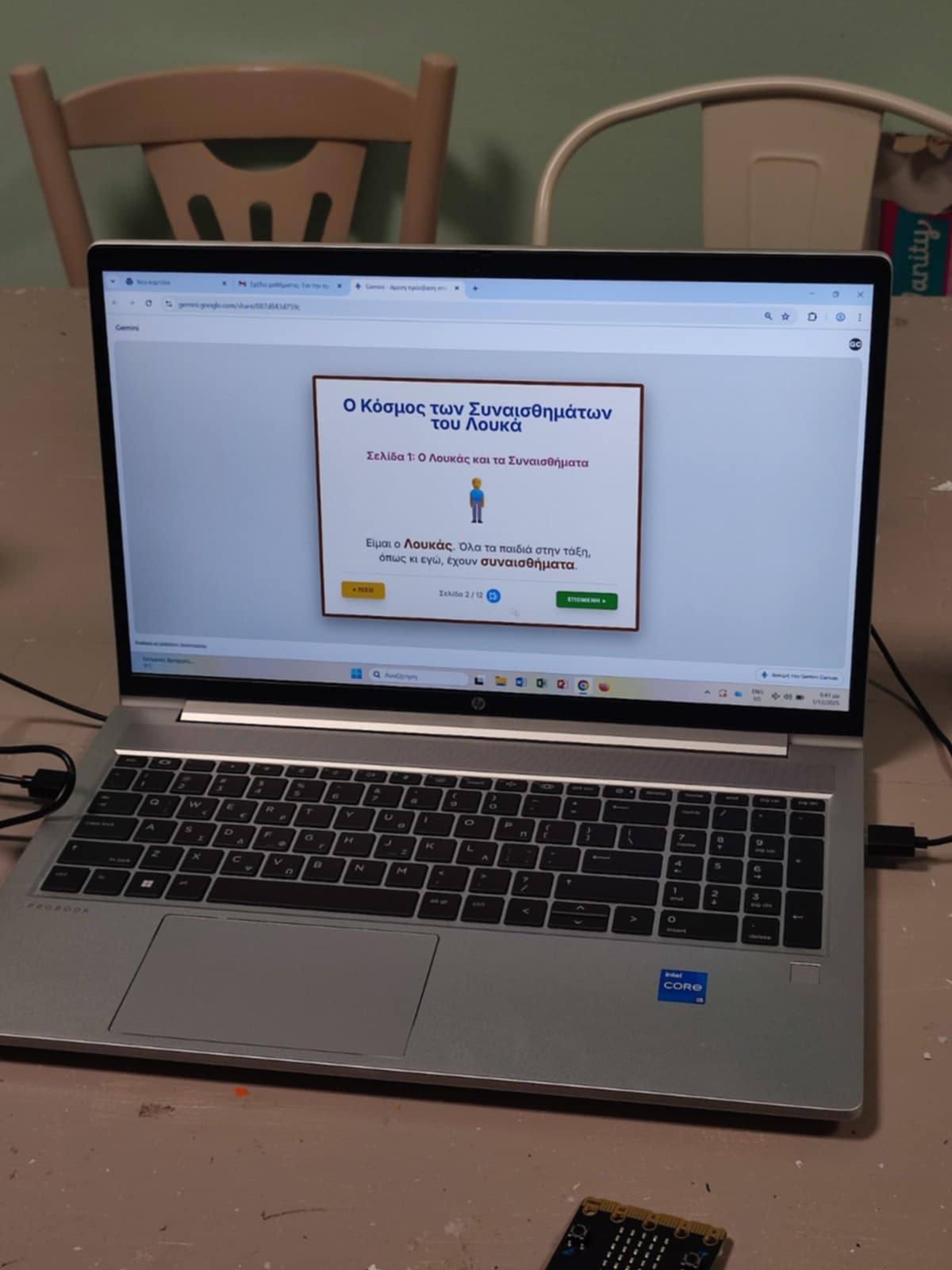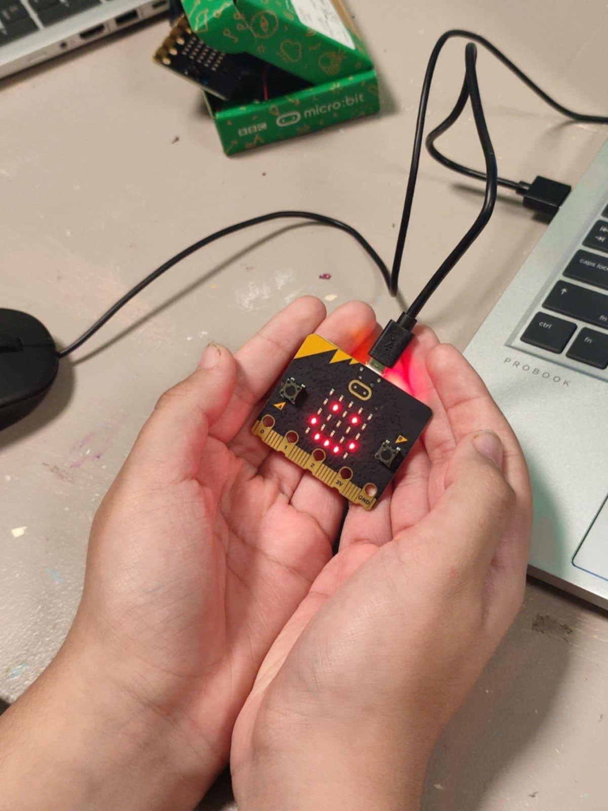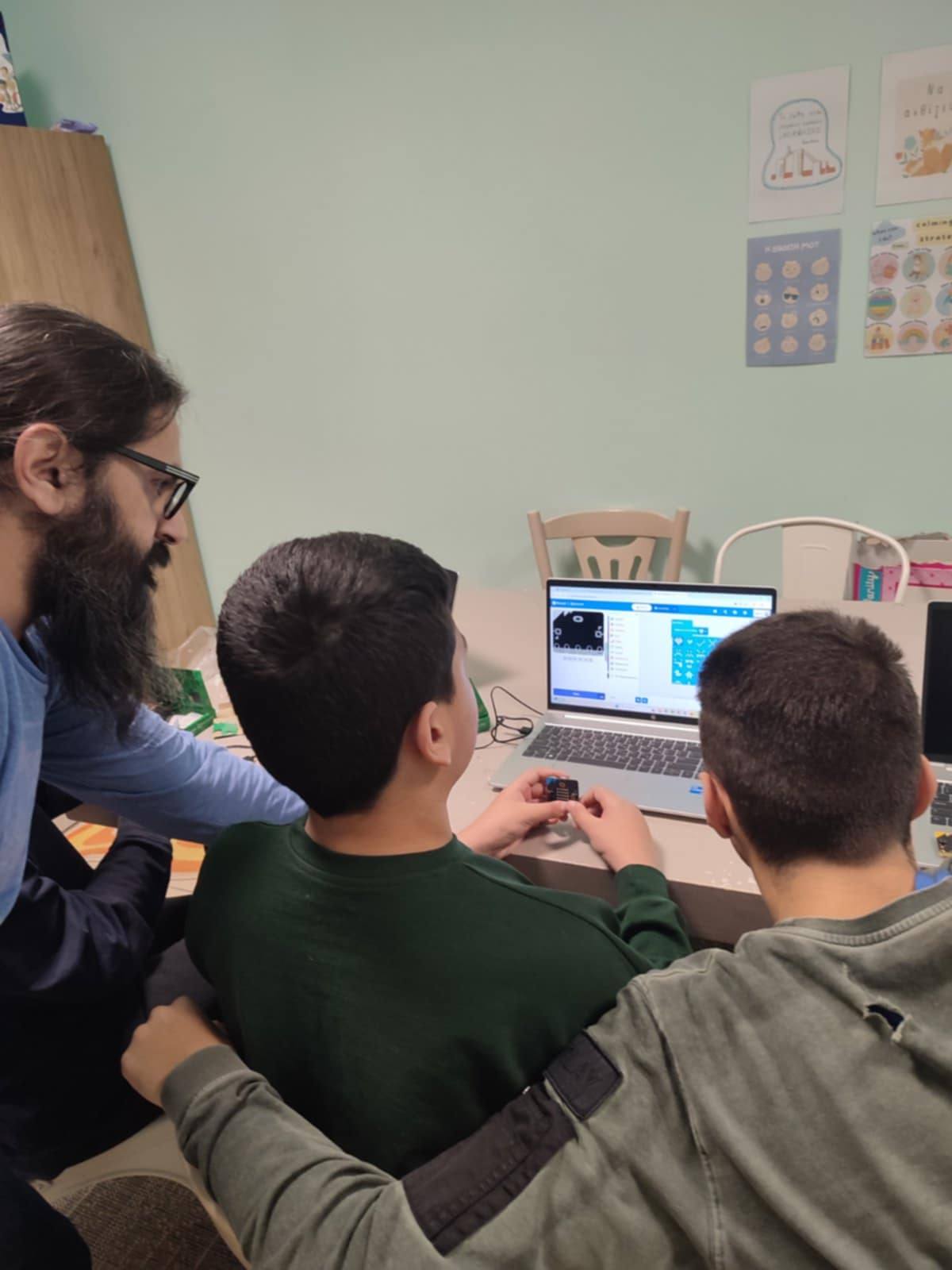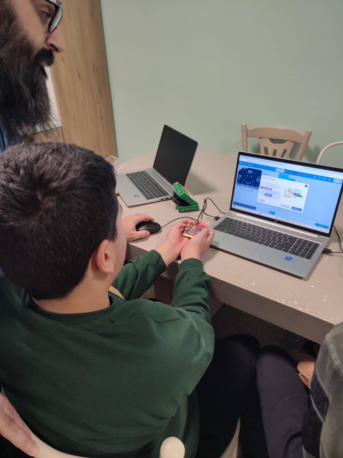 Η δράση ξεκίνησε με μια ιστορία γύρω από τα συναισθήματα, ανοίγοντας έναν ειλικρινή διάλογο για το πώς τα αναγνωρίζουμε και τα εκφράζουμε στην καθημερινότητά μας. Στη συνέχεια, οι έφηβοί μας πέρασαν στη βιωματική μάθηση: χρησιμοποιώντας το λάπτοπ και εφαρμόζοντας βασικά βήματα προγραμματισμού, κατάφεραν να προγραμματίσουν το micro:bit ώστε να εμφανίζει φατσούλες που αντιπροσώπευαν διαφορετικά συναισθήματα.